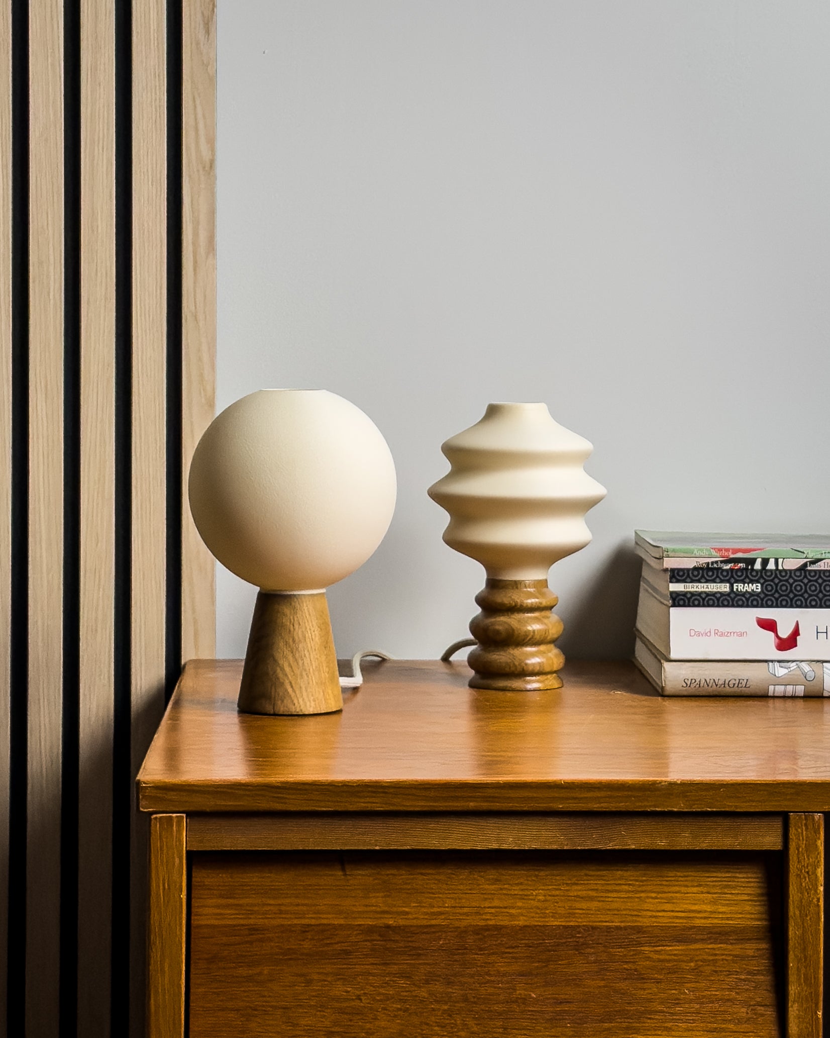 Från skulptural form till levande ljus. Dra reglaget och se hur träfibrerna fångar och sprider glöden, från ett stilrent uttryck i släckt läge till ett varmt, inbjudande sken när lampan tänds.